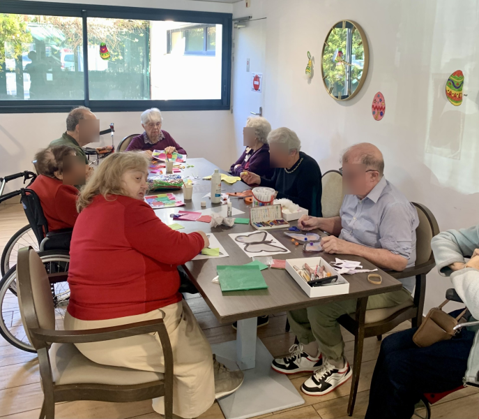Les résidents ont participé avec enthousiasme à la création de différentes décorations printanières : fleurs en papier, papillons, fresques collectives et autres réalisations colorées qui viennent égayer nos espaces de vie.